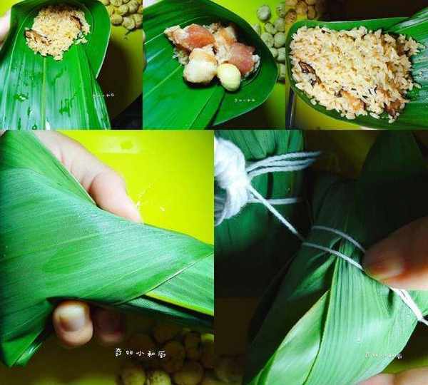 9.取兩片粽葉,疊起來,然後折成漏鬥型,舀少許炒好的糯米,壓一壓,然後加進肉塊,板栗,再填些糯米,壓緊實,然後折上封口,用繩子繞兩圈或三圈,綁緊,即可。
