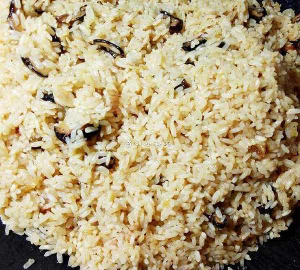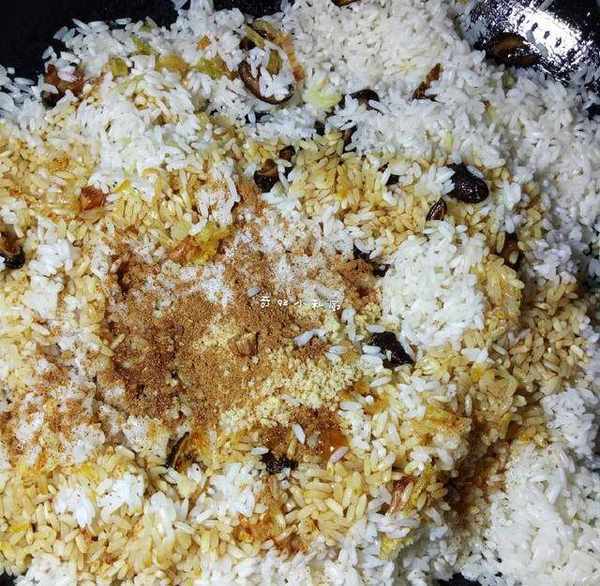 8.倒進濾幹水分的糯米,同時也倒進蔥頭酥,適量鹽,雞精,五香粉,生抽,耗油,少許冰糖,炒勻,香味出來後,就可關火瞭。(也可以加些老抽,讓粽子顏色深些)