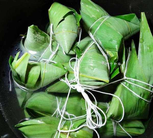 10.將綁好的粽子放進電壓鍋,同時加與粽子差不多齊平的清水,再放進一小勺鹽,按“豆類,蹄筋”檔,大約50分鐘。
