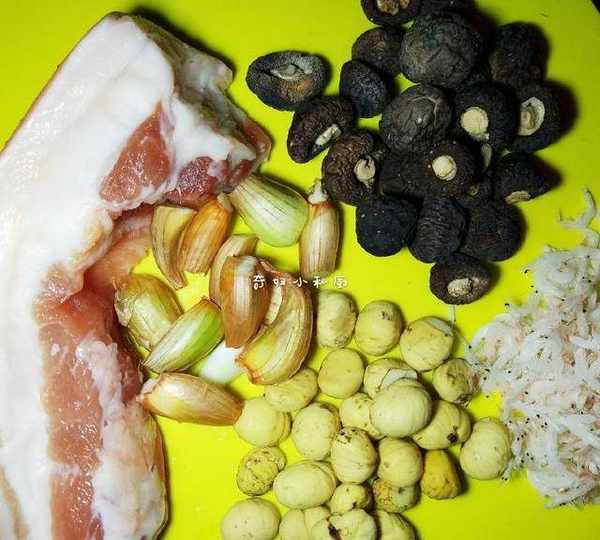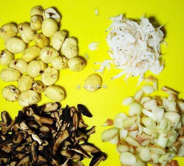 5.將板栗,蝦皮洗一下,蔥頭洗幹凈,切末,香菇泡軟,洗幹凈,剪絲,備用。