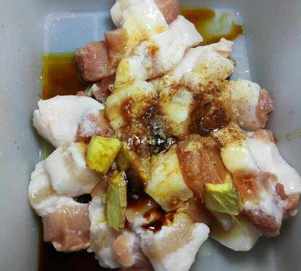 3.肉洗幹凈,去皮,切大塊,然後加少許鹽,雞精,薑片,生抽,白酒,五香粉抓勻,醃制一個晚上。