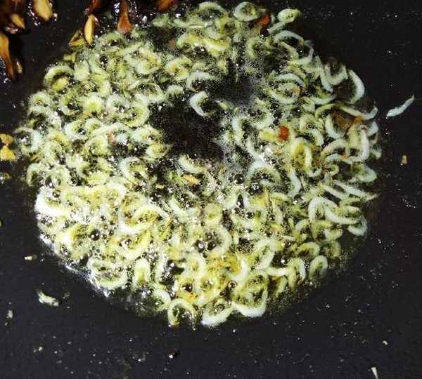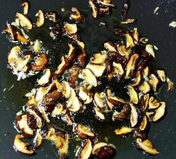 7.起鍋,鍋熱,加適量油(一次性加夠),熱油,轉小火,爆香幹蔥頭末,撈出,爆香香菇絲,香菇鏟鍋邊上,然後放進蝦皮,蝦皮一定要爆出香味,這樣粽子才會是鮮香鮮香的。