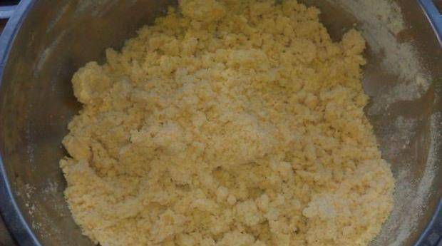 第一步黃米粉+玉米粉混合均勻後,緩緩倒入開水,將面粉用筷子攪拌如做疙瘩湯一般。