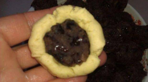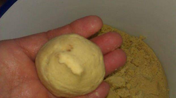 第四步取30克左右面團,用手按扁,包入一個豆餡團