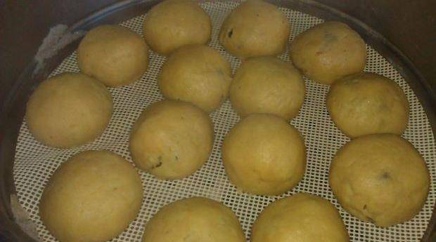 第五步同包湯圓的手法,面皮慢慢向上收,收到頭捏合,收口向下擺在蒸屜上