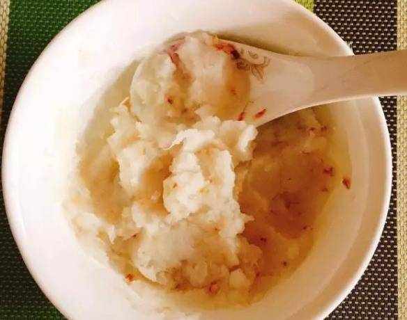 2、山藥上鍋蒸熟透,用勺子背壓成泥,再稍加蜂蜜,既為稀釋也為增加口感(我還加瞭]糖桂花,感覺更好一些);