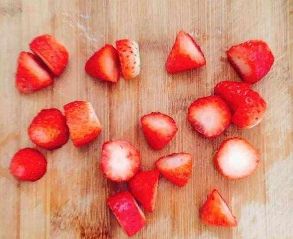 3、泡好的草莓從三分之一處切兩半;