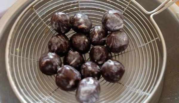 步驟3:把豆沙球放到清水裡過一下,迅速撈出,剛開始的時候因為豆沙餡料上裹的粉比較薄,一過水就容易掉,但後面會越裹越多,就不容易掉瞭;