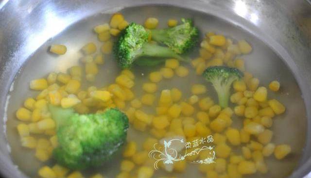 5.另外燒水,加點鹽,放入西蘭花和玉米粒煮1分鐘。