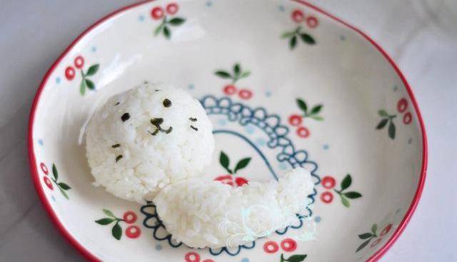 1.將燜好的米飯,加一點壽司醋拌勻,捏出小海豹的造型,擺在盤中。用海苔剪出表情,粘在米飯上。