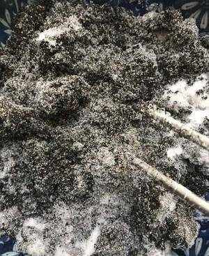 黑芝麻粉加糖和勻(沒有熟芝麻的,先洗芝麻再入鍋炒,炒至芝麻出香味或烤箱160度烤,烤時需多次翻拌)
