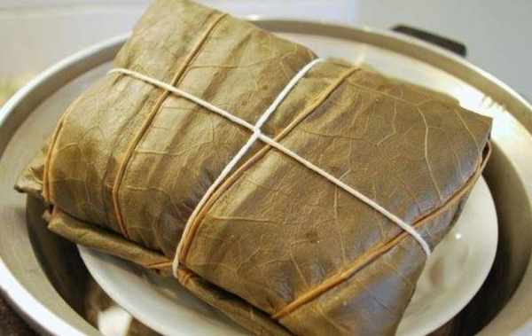 將荷葉準備好,荷葉上放入糯米飯,中間放上雞肉,再蓋上糯米飯,接著包裹起來,上鍋蒸40多分鐘就可以瞭。蒸好的糯米雞取出,打開荷葉就有一股清香味飄出來。