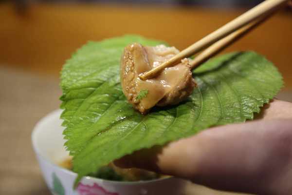 5、 吃飯時吃排骨、蓮藕可以蘸上料汁後用紫蘇葉包裹著吃很獨特的味道,美味!