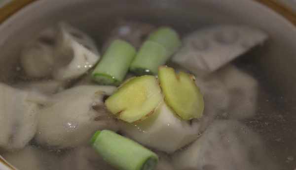 2、 粉藕洗凈去皮後切成大塊,放入砂鍋中,並加入蔥段、薑片和料酒,鍋中的湯沸騰後調最小火蓋上砂鍋蓋燉煮。