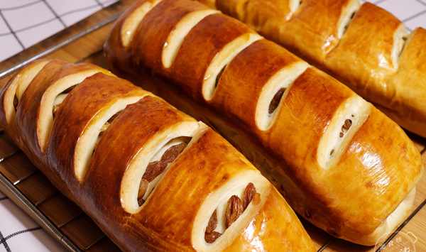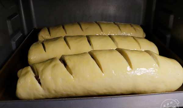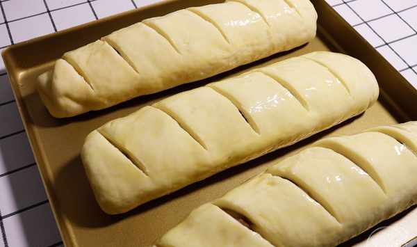 第十一步:把剩餘的麵團用同樣的方法卷成圓柱形,放入烤盤裏,室溫發酵至1.5倍,表面刷上蛋液,用鋒利的刀片在表面切斜口,漏出果仁,像這樣即可。
