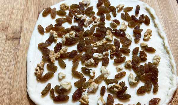 第九步:把準備好的葡萄乾核桃仁鋪在面片上,不喜歡吃甜葡萄乾可以少放一些,我喜歡吃甜一點的就多放了一些葡萄乾。