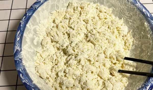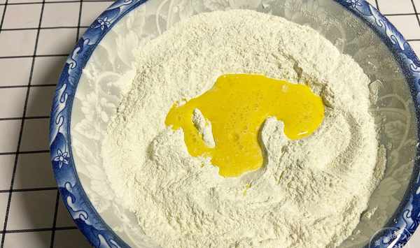 第二步:把所有的資料混合均勻,雞蛋打入小碗裏攪拌成蛋液,再倒進麵粉裏,用筷子將蛋液攪拌在麵粉裏。