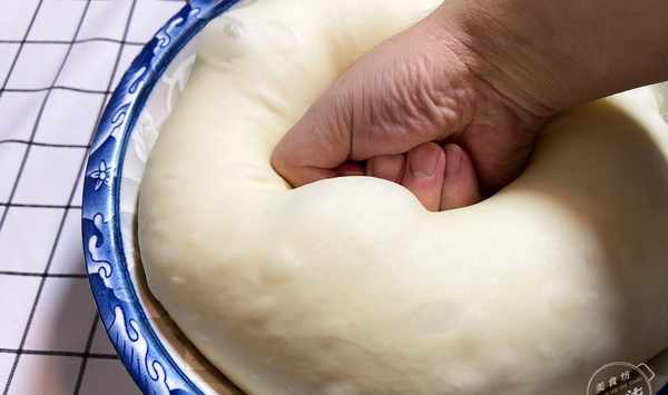 第六步:大約發酵一個小時左右,麵團產生大量的氣泡,用拳頭把發酵大的麵團壓扁。