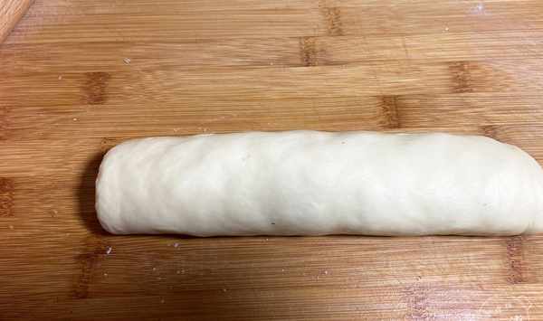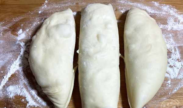 第七步:面板上撒些幹麵粉,把麵團取出放案板上,不用揉面,把面分成3等份。