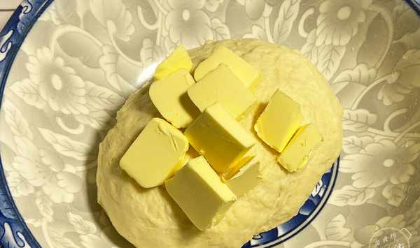 第五步:將黃油和麵團揉在一起,多揉一會,能拉出手套膜即可,然後蓋上保鮮膜發酵至兩倍大。