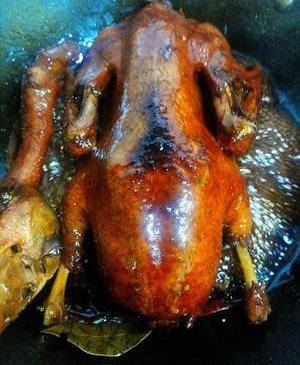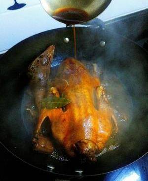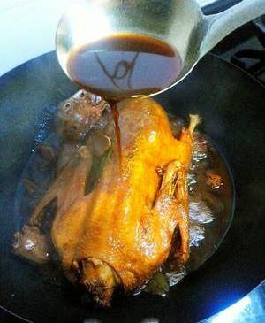 8、煮到40分鐘,開蓋用勺子將湯汁澆到上面,為瞭上色均勻,或勤翻面,這時要觀察湯汁情況,如果湯汁很多而鴨子卻已經熟瞭,那就開大火收汁,如果湯汁很少而鴨子卻還不熟時,要適當加些開水進去。