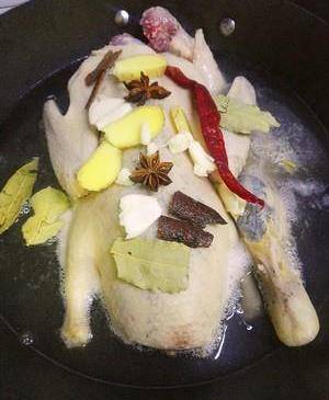 4、放入焯好水的鴨子,倒入開水(水要沒過半隻鴨子),放料酒、生薑、茴香、桂皮、香葉、蒜頭、幹辣椒。