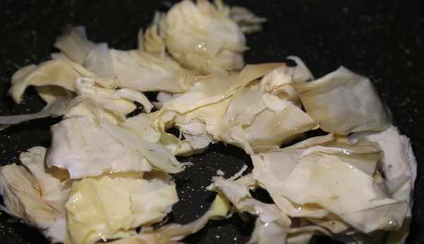 挑選呈黃白色或棕黃色,具有光澤的筍衣用溫水浸泡1小時以上,清洗幹凈放到涼水鍋中煮5、6分鐘左右控水撈出,這樣可以去除大部分草酸,食用更有益)。