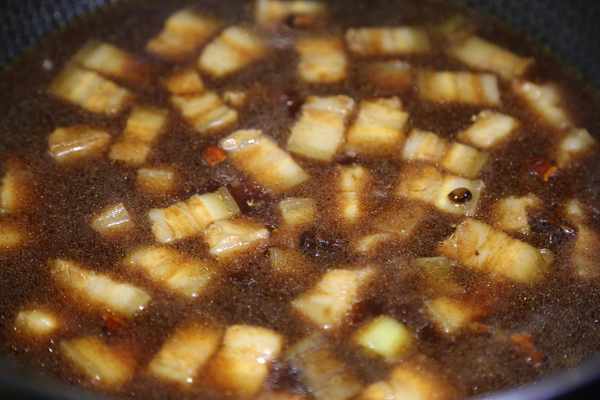 倒入開水,開水的量比單純的做紅燒肉要多些(因為後面還要放豆腐結和筍衣,它們比較吸水)。水再次沸騰後調最小火蓋上鍋蓋燉煮。