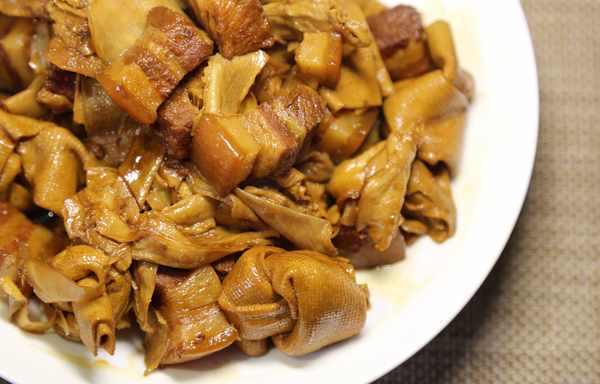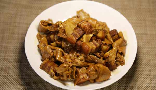 這道菜靈感來自於一道美食節目,用做紅燒肉的方法同時加入豆腐片做成的豆腐結和筍衣,三種不同營養和口感的食材碰撞出一道獨特的美味。