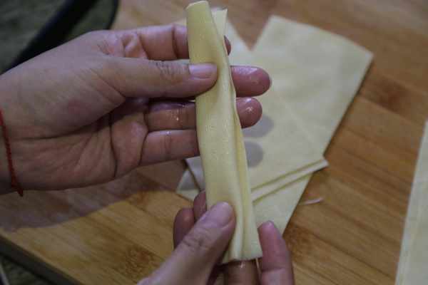 豆腐片切成寬約5厘米,長10厘米的大片狀,折疊成長條。