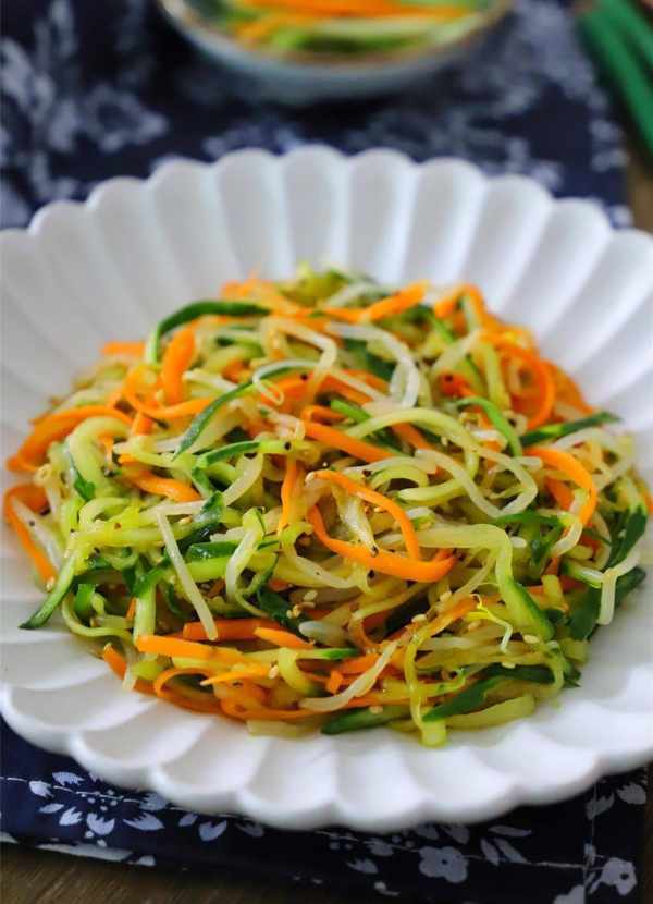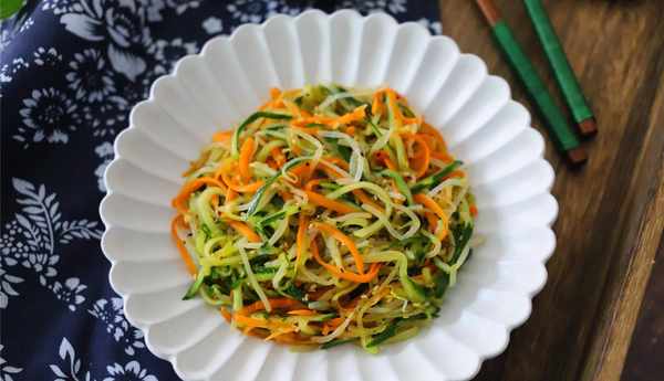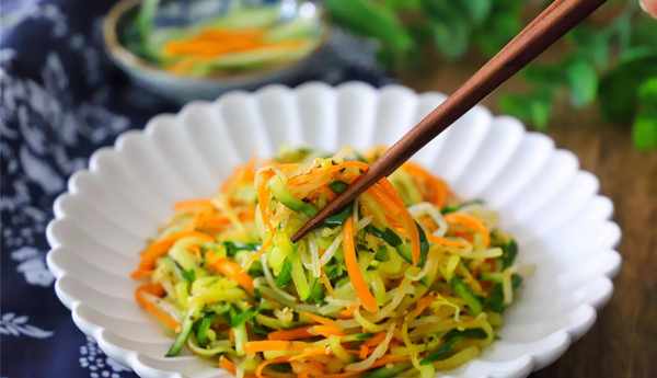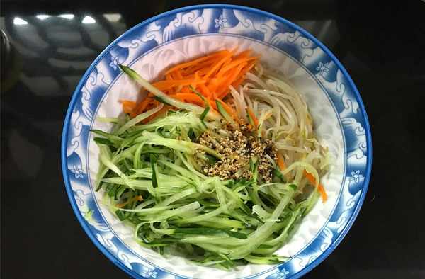 【材料】:黃瓜1根,胡蘿卜半根,綠豆芽150克,生抽2勺,亞麻籽油1勺,米醋2勺,蜂蜜1.5勺,黑胡椒碎半勺,熟白芝麻半勺