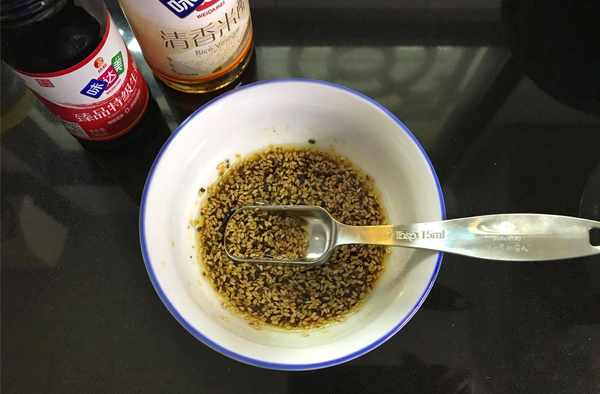 5、再來調一碗萬能的油醋汁,1勺亞麻籽油,2勺米醋,1.5勺蜂蜜,半勺黑胡椒碎,半勺熟白芝麻放入碗中,調勻即可。