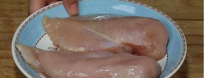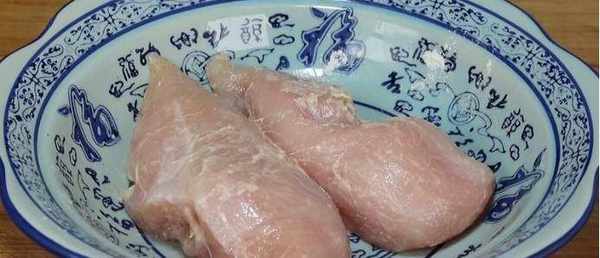 2、先將咱們準備好的雞胸肉取出來,把雞胸肉處理一下,將它表面的筋膜和脂肪全部去掉,然後咱們將其放到一個大碗中,加入準備好的一大勺面粉,用手將它們抓拌一下,將雞胸肉抓至粘稠狀,然後倒水將其抓洗一遍,面粉有很強的吸附性,能夠吸附它裡面的雜質,所以用面粉水可以將雞胸肉清洗得非常幹凈瞭。