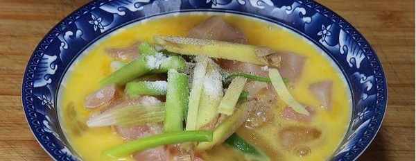 4、用筷子將這兩個雞蛋攪散,接下來直接把蛋液倒入到雞胸肉中,加入蔥段和薑絲,然後再放上適量的鹽,胡椒粉,蠔油,生抽和老抽,用手抓拌均勻,放到一旁醃制20分鐘讓它入味。