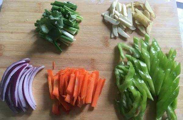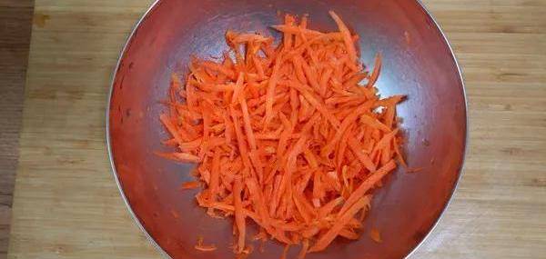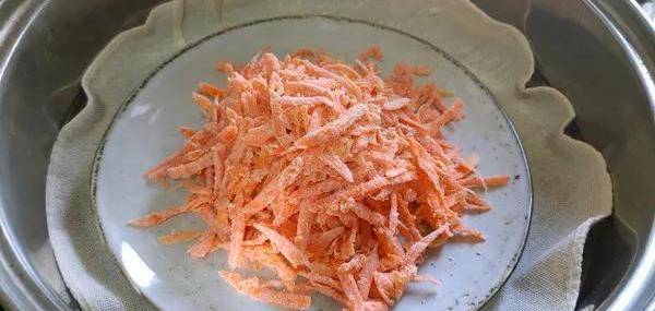 1.首先準備新鮮的胡蘿卜一根,去掉外皮,先給它切成厚厚的薄片,最後切成細絲。放入幹凈的玻璃碗中。