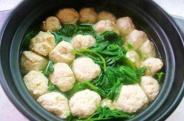 3.用小火煮至定型,然後再開大火煮沸五分鐘。丸子煮熟後放入少許的胡椒粉調味,然後再放入自己喜歡吃的青菜用大火煮熟就可以吃啦。