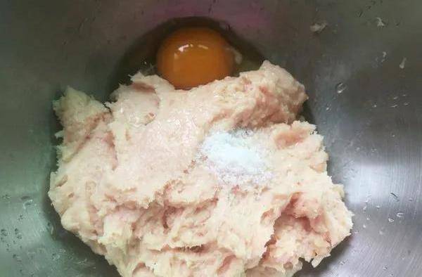 2.五分鐘後往裡面加入新鮮的母雞蛋,然後再加入精鹽、雞精、胡椒粉調味。放入一碗水淀粉。使雞胸肉充分的吸足水分。炒鍋內加入適量的清水大火燒開。水燒開後把雞肉丸子一個個的放入鍋內。
