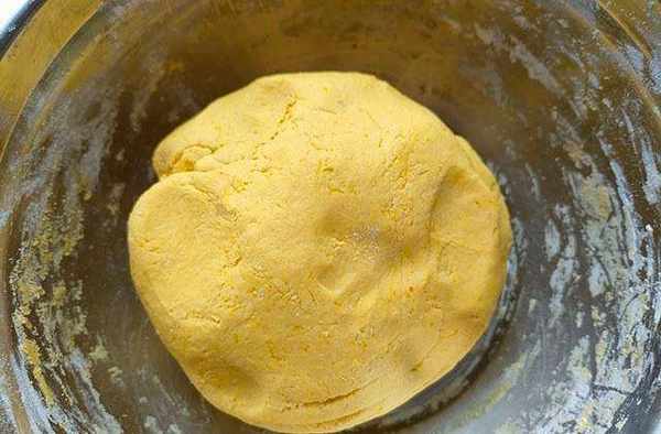 4、第一次拌好的南瓜糊放至溫熱,然後倒入剩下的150克糯米粉揉成面團。
