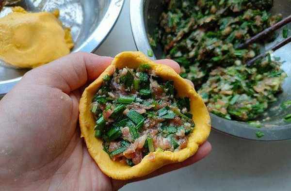 5、取一小塊南瓜面團,徒手整理成碗口一樣的形狀,再放上一勺韭菜肉餡,最後慢慢將口收好捏緊。