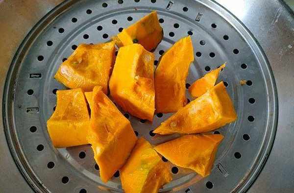1、南瓜去掉瓤和皮,切塊放入蒸鍋裡面蒸熟。