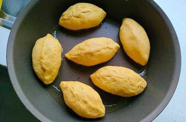 7、南瓜餅單面煎好以後翻面繼續煎至微黃,然後倒入半碗清水,蓋上鍋蓋保持中小火煎至水分蒸幹,這時的南瓜餅底部酥脆、餡料熟透後就可以吃瞭。