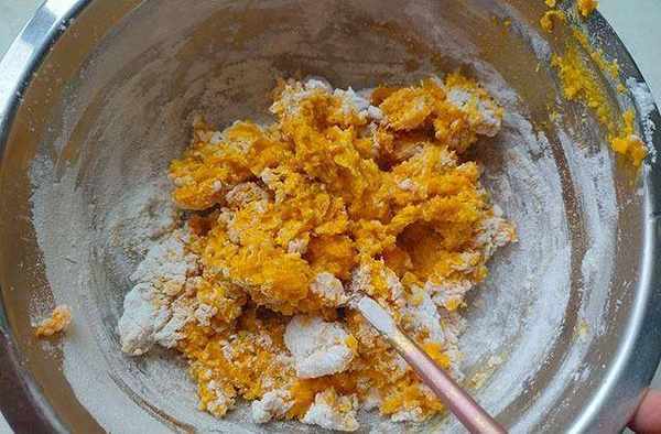 糯米粉燙過之後,黏性非常大,所以先放入南瓜泥的糯米粉不能太多,四分之一就足夠瞭,放多瞭揉面食容易沾手。