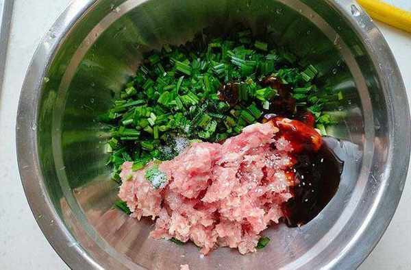 2、韭菜洗凈後切碎放入盤中,然後放入肉餡、一勺生抽、一勺蠔油、一克鹽、一克雞精,按順時針攪拌均勻,調成餡料備用。