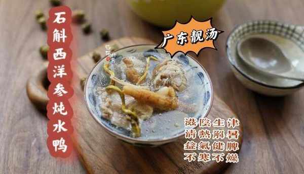 西洋參,有清熱的作用,而石斛有滋陰生津的作用,把它們和水鴨放在一起煲湯,清熱解毒,滋陰又生津。廣東人煲湯除瞭用瘦肉、骨頭以外,有些食材會比較講究,比如水鴨就是其中之一,水鴨肉性寒,有一定的滋陰益腎、清熱涼血的作用,把它和性溫的西洋參、石斛放在一起煲湯,有淡淡的回甘,因為西洋參除瞭泡水飲用以外,煲湯也很合適,清心、安神,是廣東湯裡經常用到的食材。