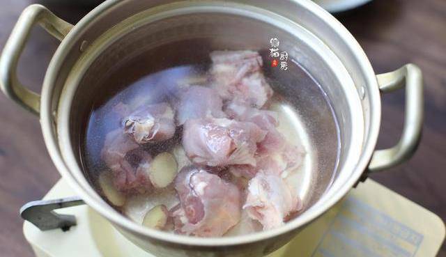 4.切好的水鴨肉和薑片放入冷水鍋中,煮沸汆燙2分鐘。煮出血水和腥味,撈出鴨肉沖洗幹凈。