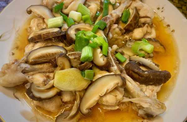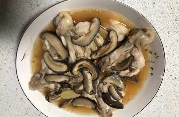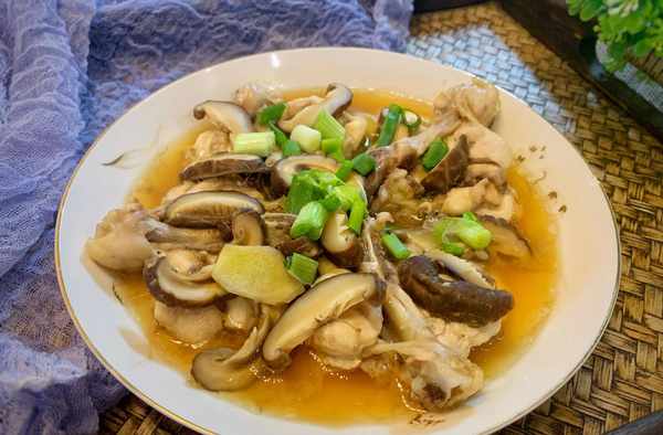 食材:香菇幹3個,雞腿4個,生薑少許,生蔥1根,花生油適量,食用鹽適量,生抽適量,雞精適量。