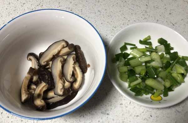 第二步:趁著解凍雞腿的時間準備其他食材,取一個碗放入3個香菇幹,加入開水泡發,香菇被泡軟以後擠掉水份,再用清水清洗幹凈,用刀切成香菇薄片備用,生蔥摘除頭尾清洗幹凈切成蔥花備用,生薑去皮切成薄片備用。