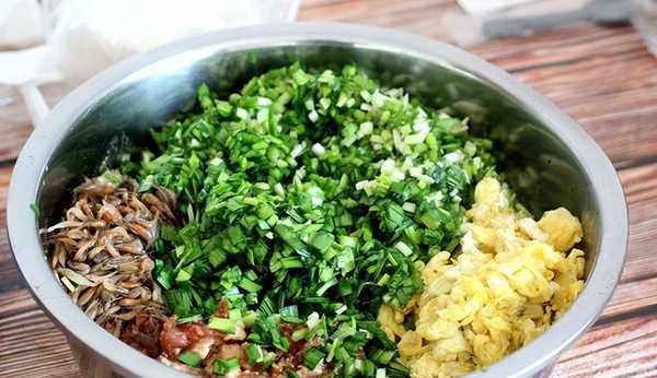 原料:蝦仁200克,煮熟的豬肉、韭菜各100克,雞蛋兩個。