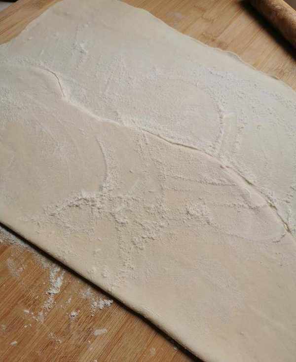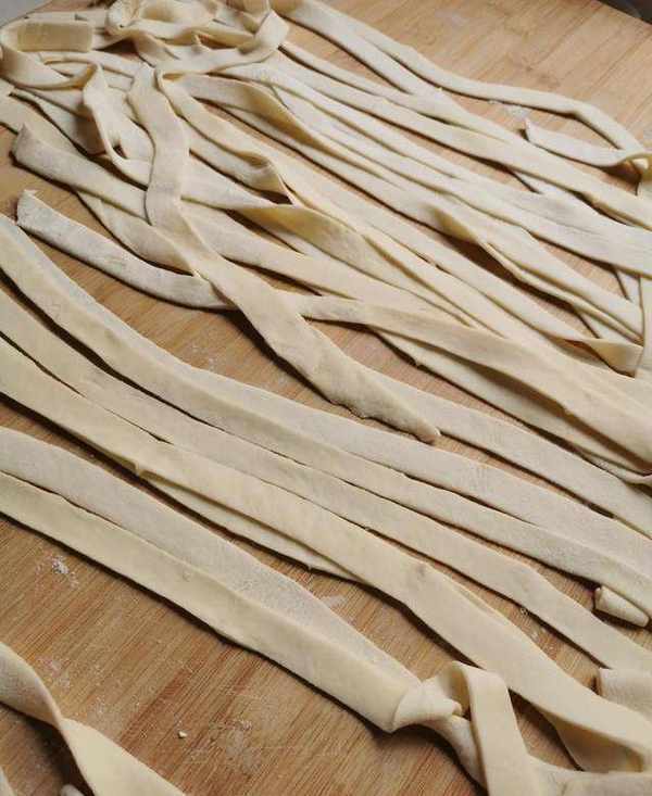 折疊好的面皮就可以切成面條瞭,我喜歡吃寬面,所以面條切的稍微粗一些。把切好的面條撒開,平鋪放在面板上,謹防粘連。