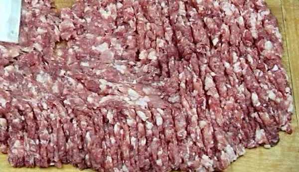 4、先把肉切成片,然後再切成小肉丁,最後放在板子上剁成肉末!